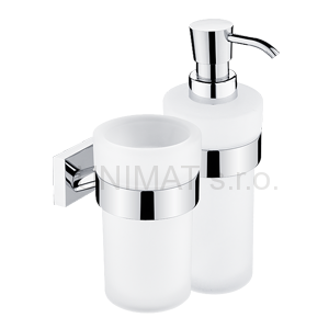 Držiak dávkovača a pohárika z matného skla. Pumpička plast. Objem dávkovača 250ml.
