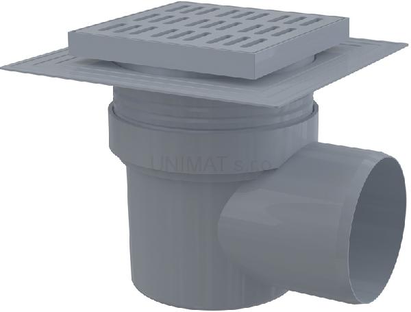 Podlahová vpusť 150 × 150/110 bočná, mriežka šedá, límec, APV10