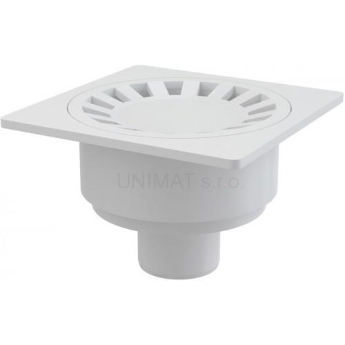 - Podlahová vpusť 150 × 150/50 priama, mriežka biela, vodná uzávera APV16