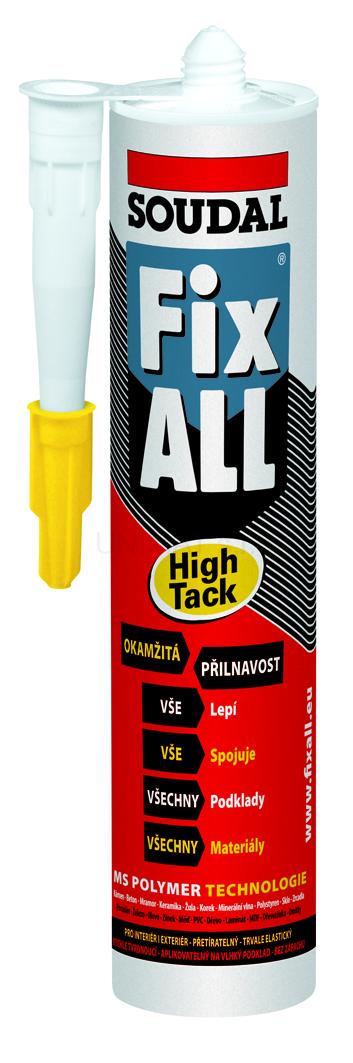 SOUDAL Fix All High Tack je neutrálny mimoriadne kvalitný pružný lepiaci tmel s vysokou počiatočnou priľnavosťou. Vhodný na lepenie, spájanie a tmelenie širokého spektra materiálov v interiéri aj exteriéri, akékoľvek lepenie a tmelenie savých aj nesavých materiálov v domácnosti, na stavbe alebo automobile. Fix All High Tack nahrádza väčšinu dostupných lepidiel alebo tmelov. Výborne priľne na bežné materiály: betón, omietky, prírodný aj umelý kameň, drevo, drevotrieska, laminát, plasty, polystyrén, PVC, korok, minerálna aj sklená vata, železo, olovo, zinok, meď, hliník, sklo, obklady a dlažby, sanitárna keramika, porcelán, zrkadlá a mnoho ďalších.