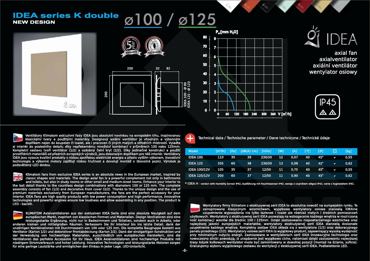 Ventilátor rady IDEA series K je v základe vybavený motorom s guličkovými ložiskami, ktoré znižujú hluk a predlžujú životnosť výrobku. Je možné ich montovať v ľubovoľnej polohe. Designový axiálny ventilátor je vhodný do kúpelní, toaliet ale aj pracovní a iných malýcha stredných miestností.